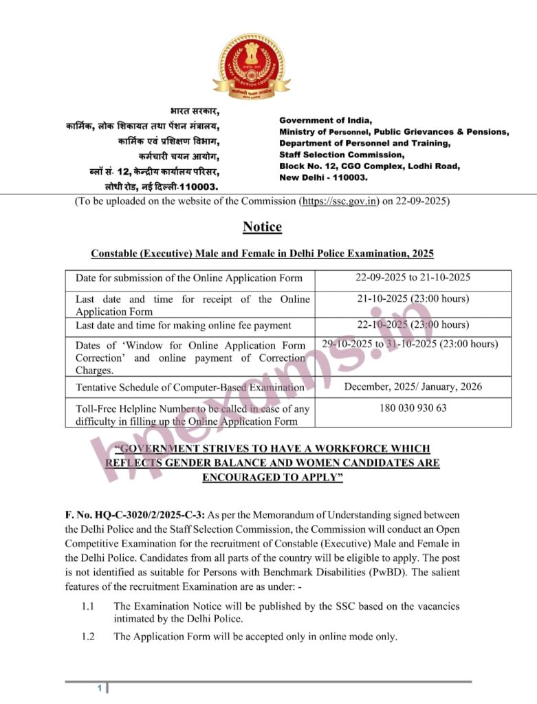 SSC has released a notification for the recruitment of Constable (Executive) Male and Female in Delhi Police. Candidates from all parts of the country will be eligible to apply. Last Date of the online application form is 21 October 2025. Interested and eligible candidates can apply online here –https://ssc.gov.in/login